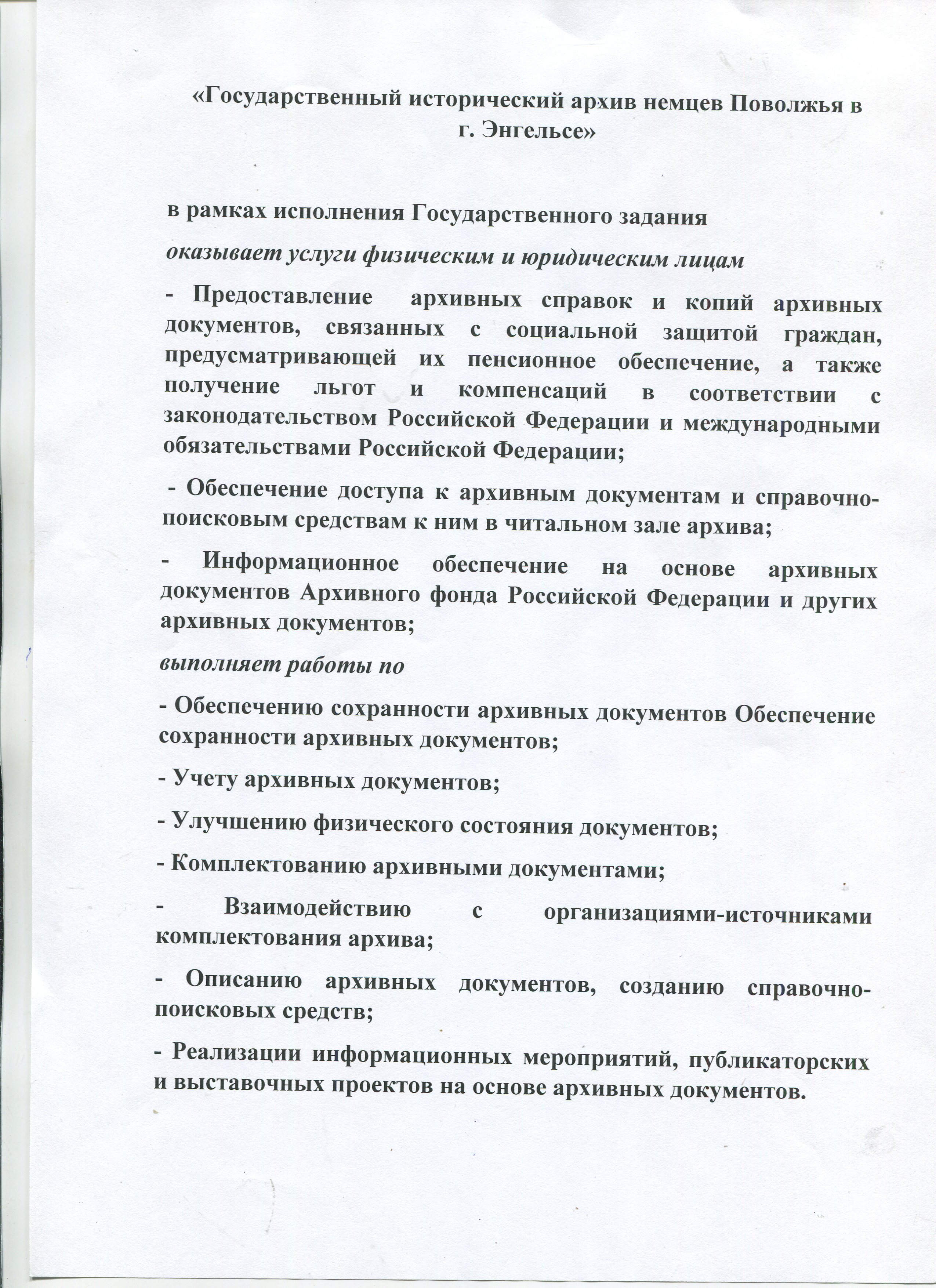 «Государственный исторический архив немцев Поволжья в г. Энгельсе» оказывает услуги