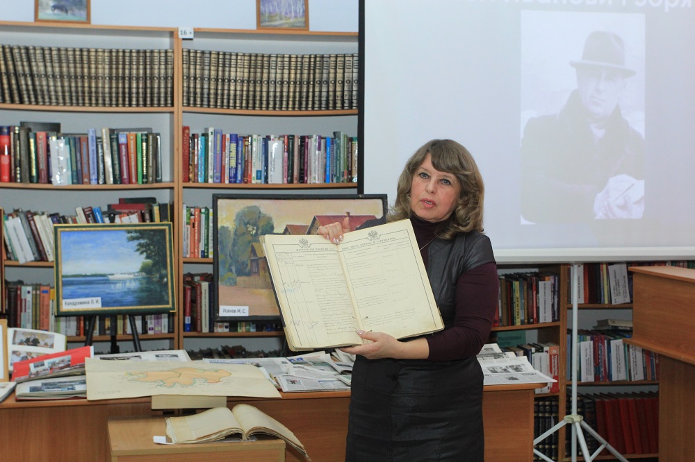 Ведущая гостиной, заведующая отделом краеведения Центральной городской библиотеки, О. В. Шитт познакомила гостей с планом юбилейных мероприятий, посвященных творчеству местных художников.